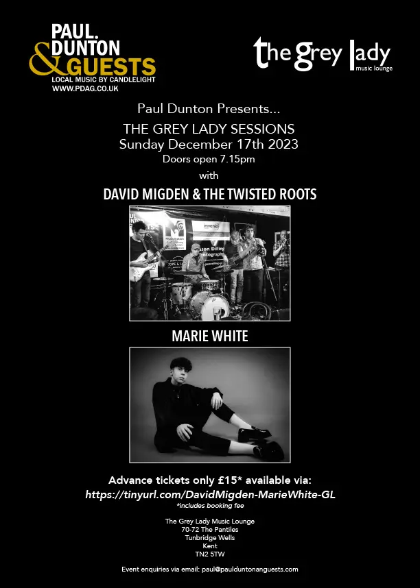 Join us on Sunday December 17th at The Grey Lady Music Lounge on The Pantiles for a superb ‘Grey Lady Sessions’ featuring live performances from two of the local areas finest original acts DAVID MIGDEN & THE TWISTED ROOTS and MARIE WHITE. This will be a dual headline all seated candlelit concert with the bar available for the duration of the event. Please note the kitchen will be closed but all customers are welcome to order in and we can provide plates and cutlery. Doors will open at 7.15pm with music starting at 8pm.